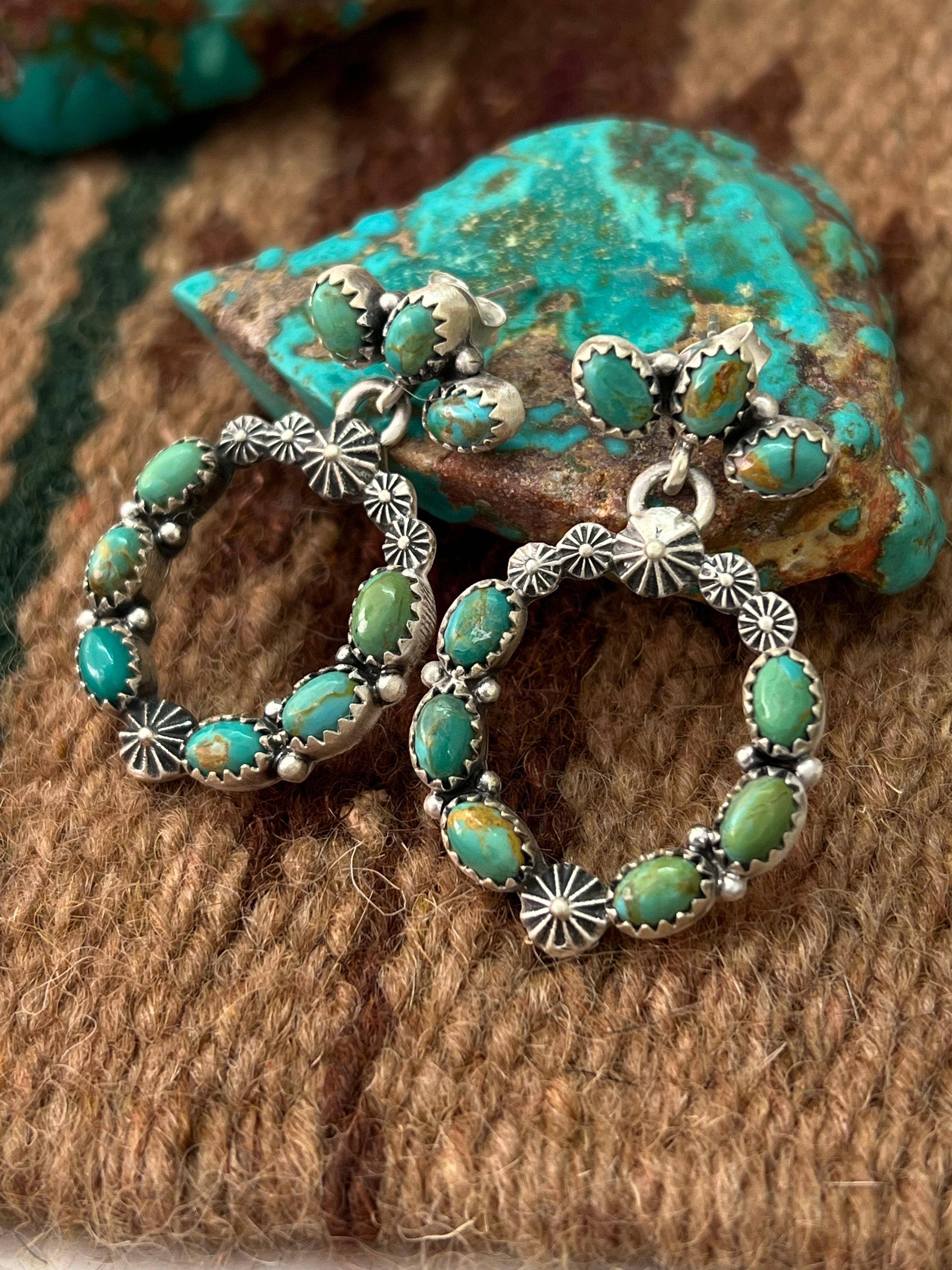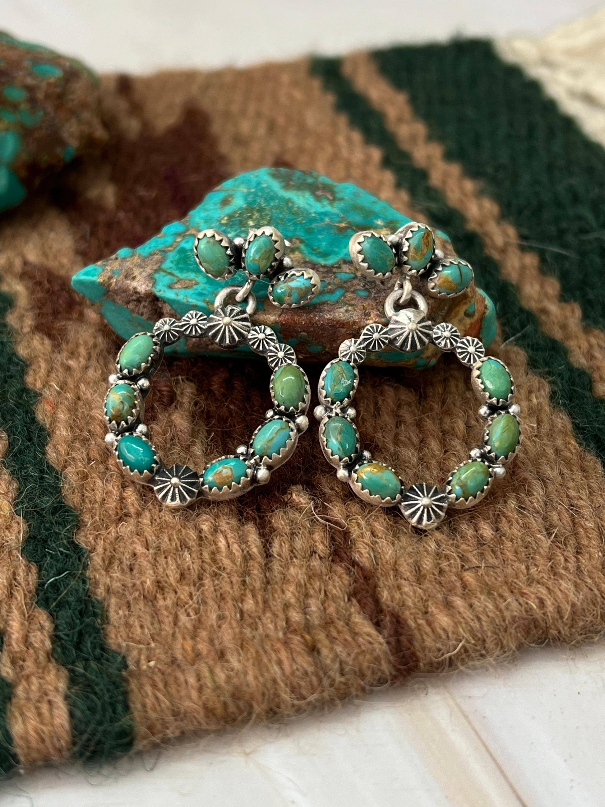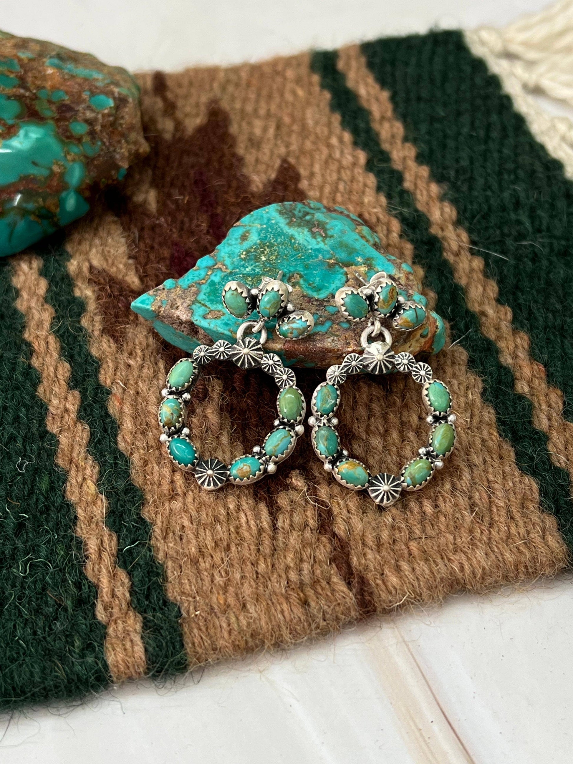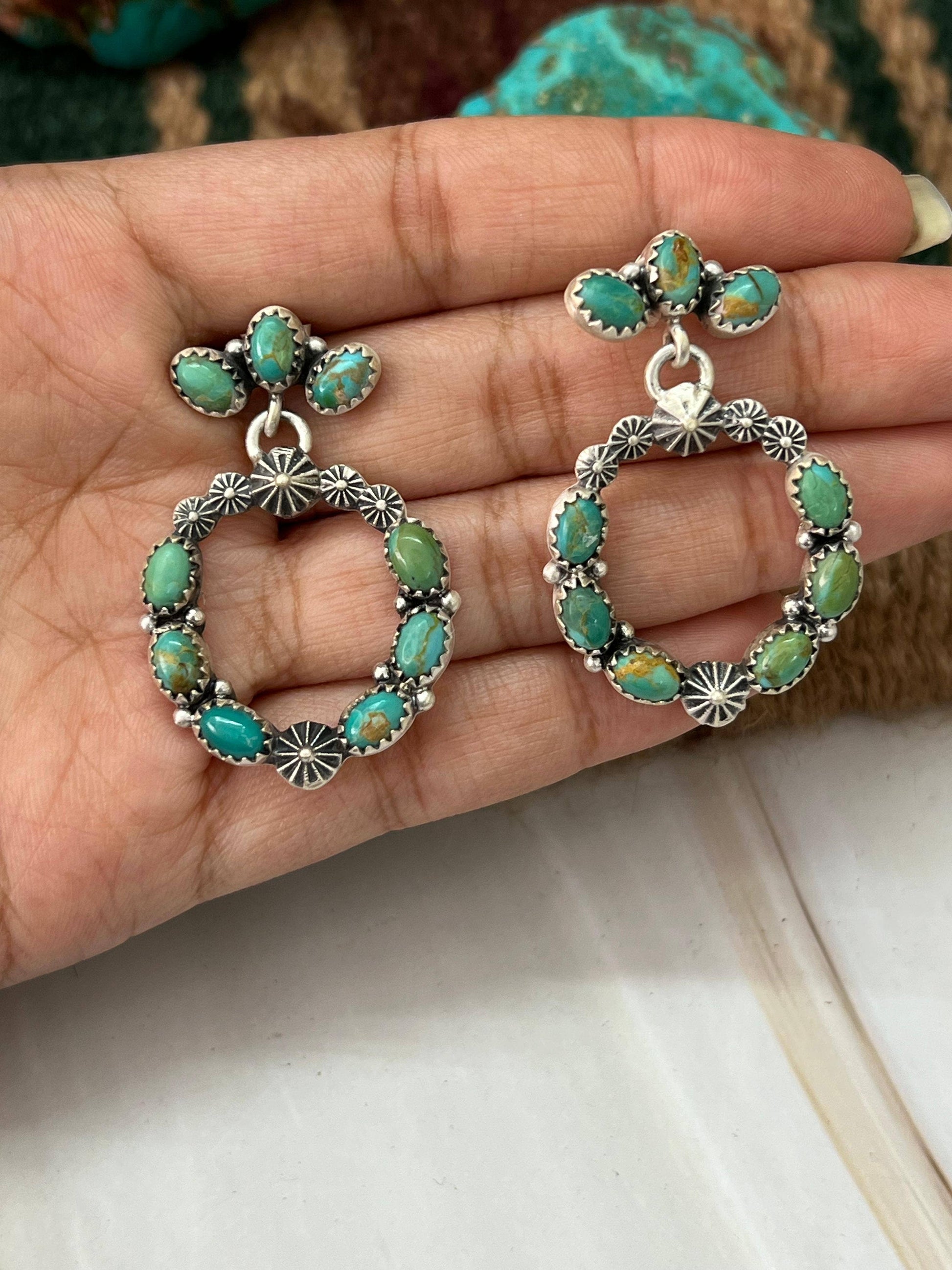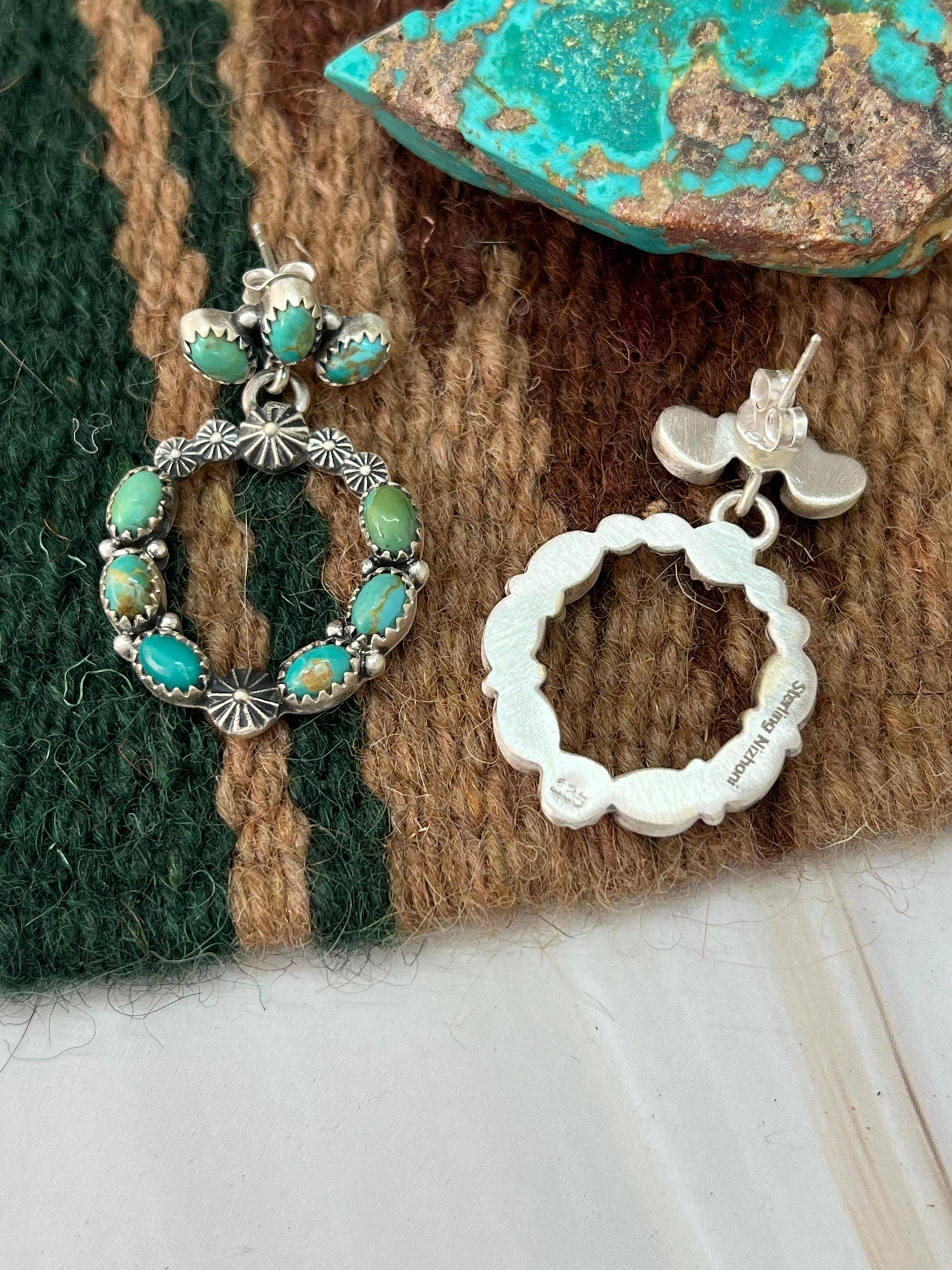 How gorgeous are these Handmade Natural Kingman Turquoise Post Earrings!! These are lightweight and measuring 1 3/8" long 1" wide! Stamped with “Sterling” and signed.