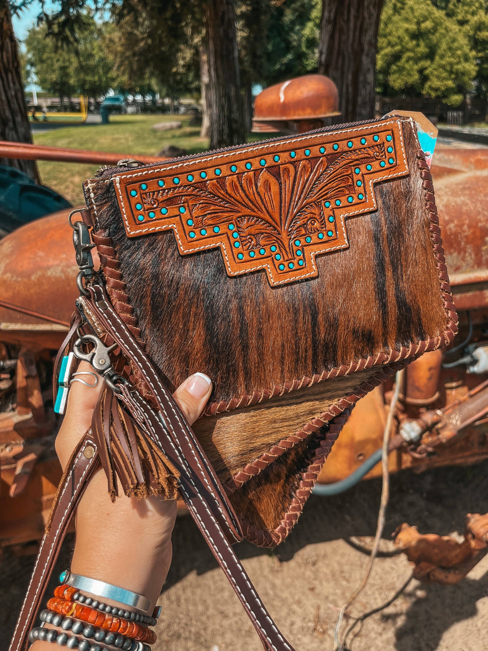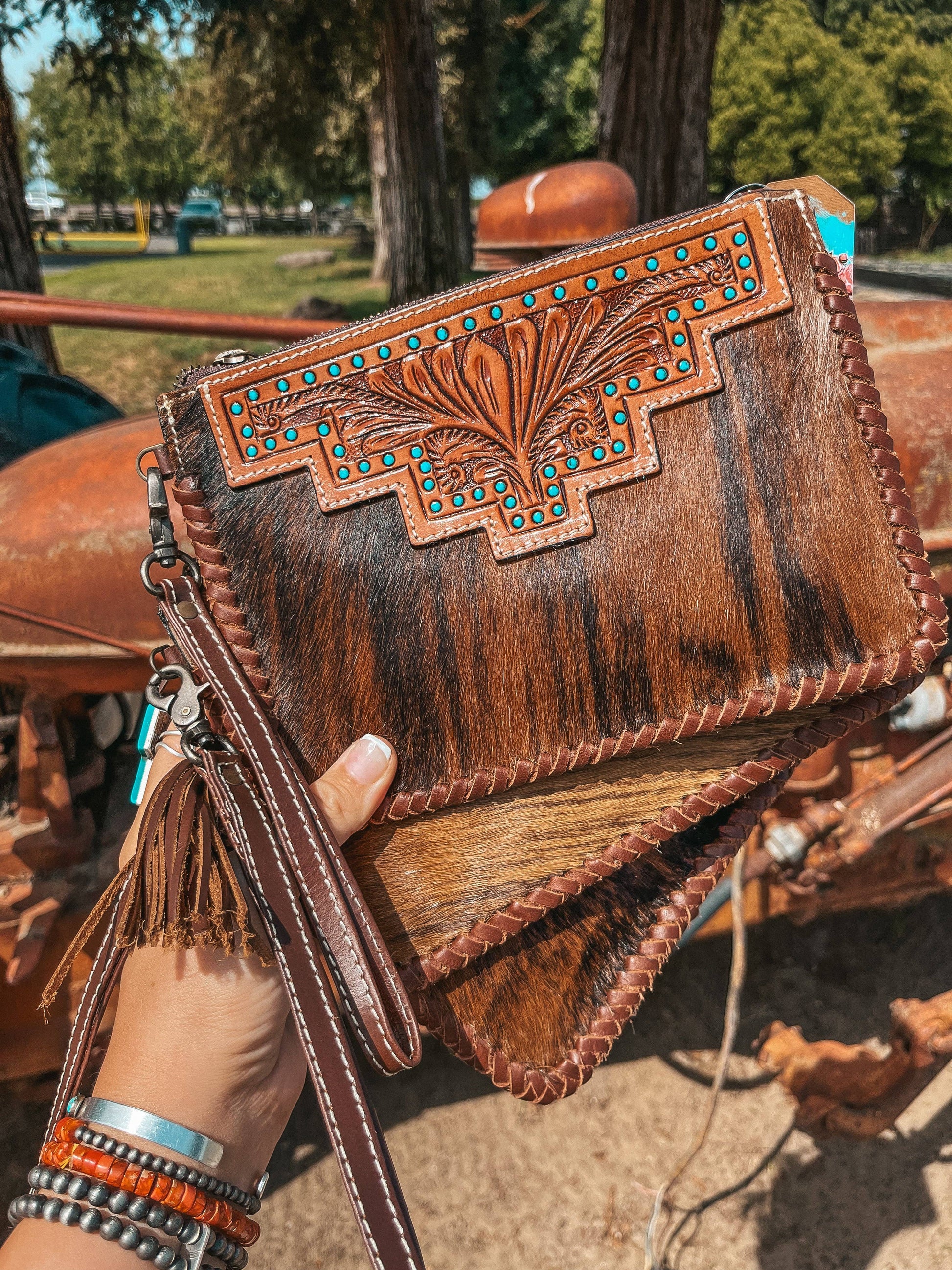 Handcrafted from genuine hair on Hyde and accented with a beautifully hand-tooled leather flap, this Haute Southern Hyde wristlet brings rustic charm and Western soul to your everyday essentials. Each piece is one-of-a-kind, with natural hair-on-hide variation and hand painted turquoise-studded detailing that adds bold personality.